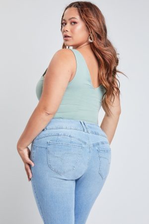 Your favorite jean is now made with recycled fibers so you can look good and feel good! Our Plus 3-Button WannaBettaButt Mid-Rise Skinny Jean Made With Recycled Fibers features our signature WBB heart-shaped stitching that contours and lifts your bum and our uniquely crafted pockets that highlight your natural curves! Made with an exposed 3-Button Fly and light whiskering for a vintage vibe. We love these jeans paired with a bodysuit or front-tucked blouse to show off the button detailing. Complete the look with some small hoop earrings and booties!Â