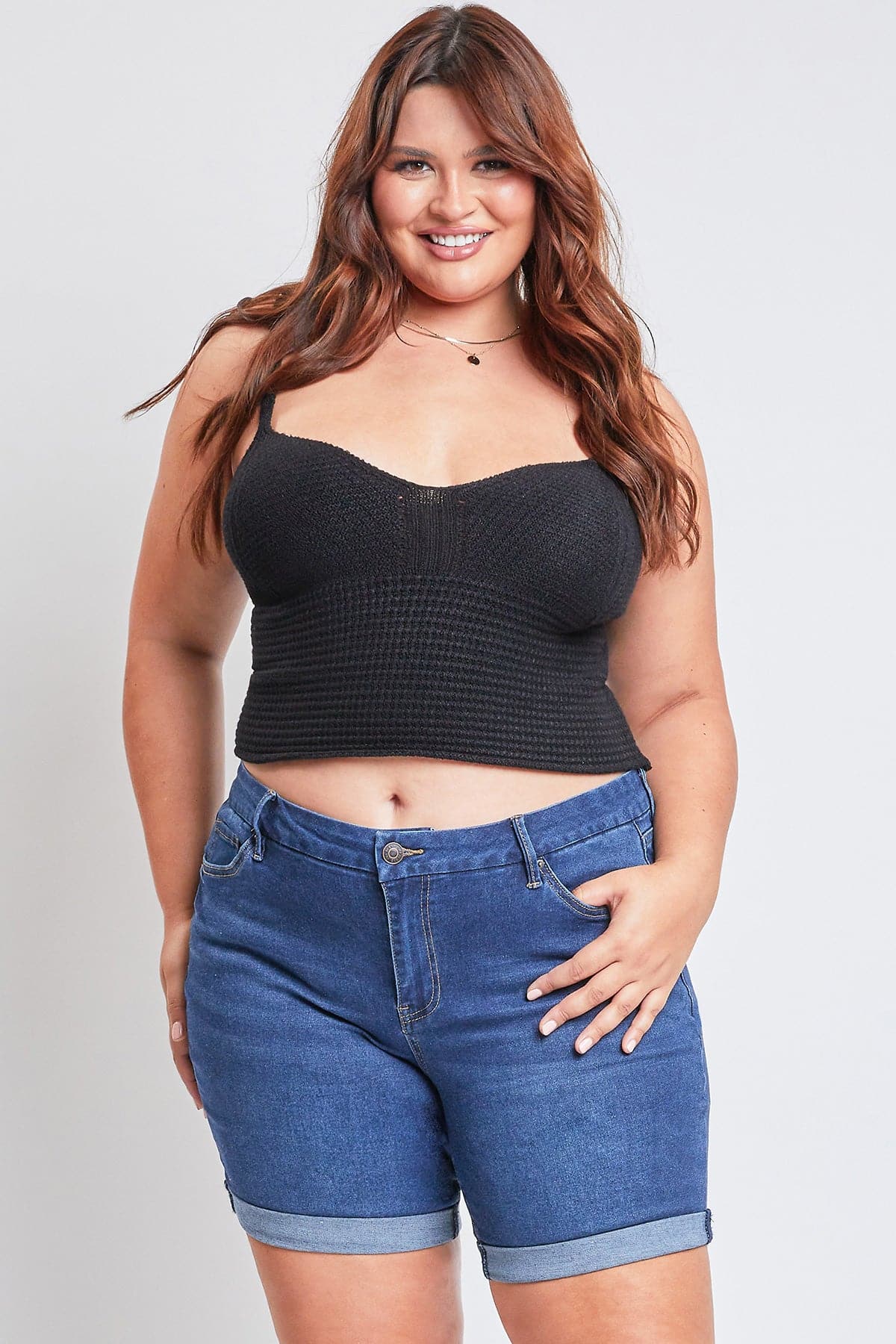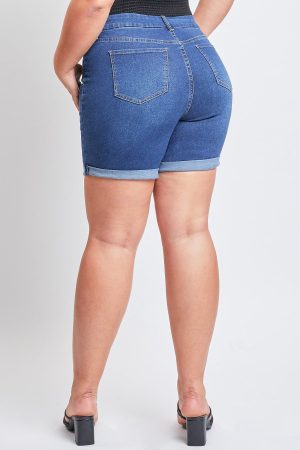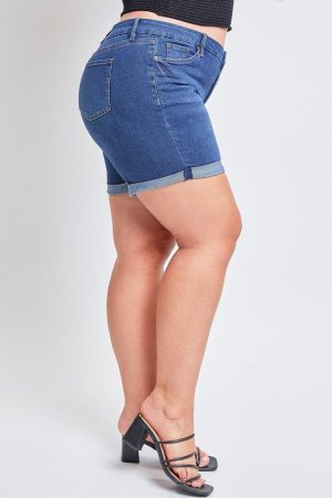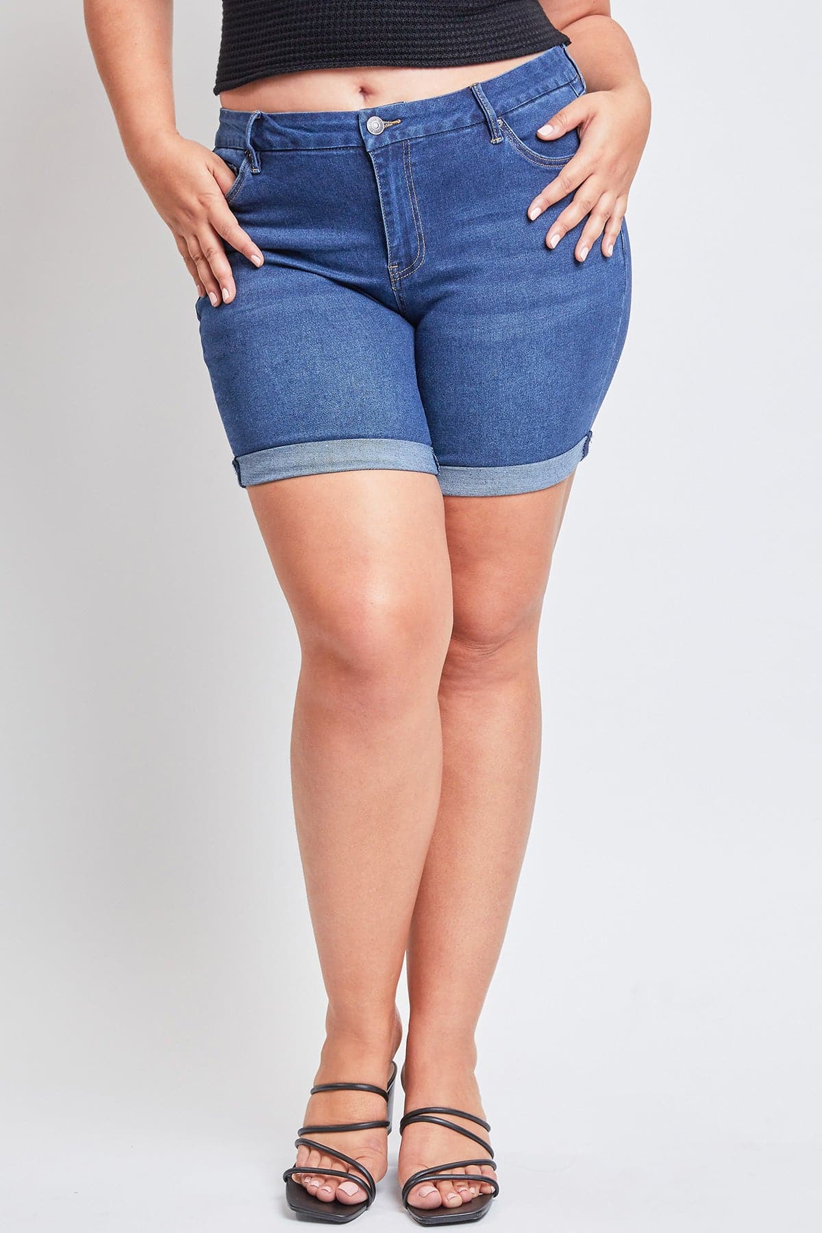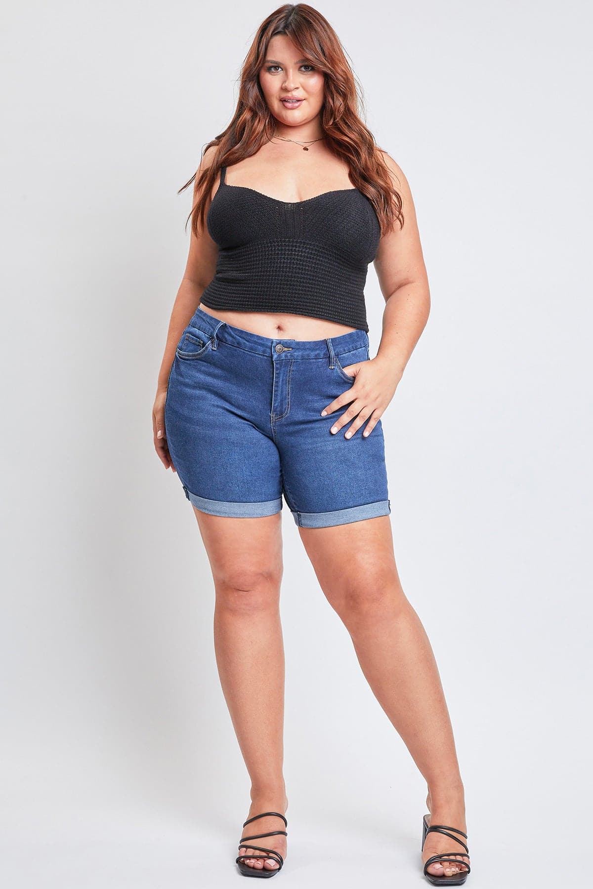 Upgrade your Summer wardrobe with our Women’s Plus Curvy Fit High-Rise Jean Shorts With Rolled Cuffs. Featuring our highest rise and a narrower waist with a contoured band so you no longer have to worry about gapping! Our Curvy Fit is made with a little extra room in the hips and thighs to ensure the best fit. Featuring cuffed hems for a laid-back look. Perfect for any casual occasion, these shorts will quickly become a staple in your wardrobe. Pair with a bodysuit and sneakers for an easy-going look, or dress up with a floral blouse and sandals!