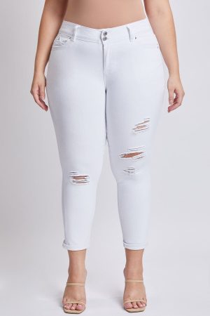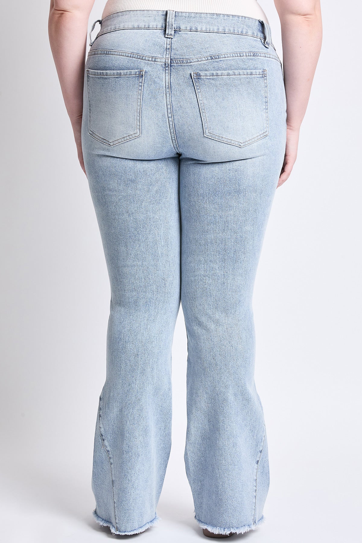 Women’s Plus Low Rise Frayed Hem Flare Jeans by YMI Jeans — a perfect blend of retro flair and modern comfort. These jeans feature a low-rise waist and a flared silhouette, offering a trendy throwback style that flatters your curves.